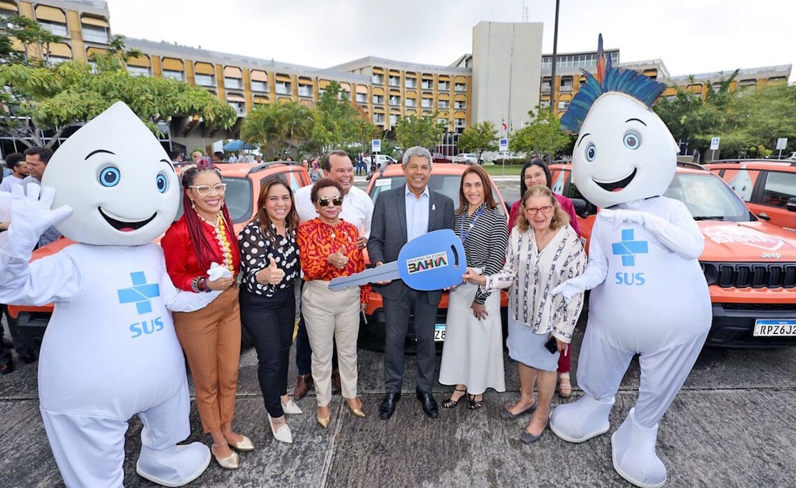 O governador Jerônimo Rodrigues (PT) fez, na manhã desta quarta-feira (13), a entrega simbólica de dez veículos exclusivos para vacinação aos representantes dos nove Núcleos Regionais de Saúde (NRS) da Bahia. A cerimônia ocorreu no pátio da Secretaria Estadual de Saúde (Sesab), no Centro Administrativo da Bahia, em Salvador.