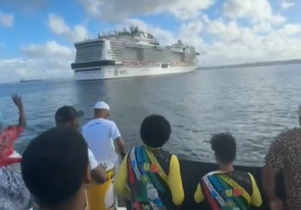 O receptivo da embarcação ocorreu em alto mar. O momento foi divulgado pelo diretor de Turismo de Salvador, Gegê Magalhães em seu Instagram. Com a chegada do MSC Grandiosa, a expectativa é de que 6 mil cruzeiristas desembarquem na cidade.